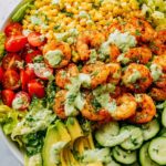 In a large bowl, I combine chopped romaine, grape tomatoes, sliced mini cucumbers, avocado slices, green onions, corn, cilantro, and shrimp. Drizzle generously with cilantro lime dressing and toss gently to coat without mashing the avocado. This salad shines fresh, right away—so dig in or keep chilled for up to an hour for flavors to meld.