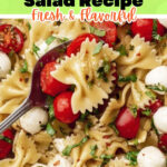 I don’t recommend freezing this salad — the fresh tomatoes and mozzarella don’t hold up well when thawed, often becoming watery or rubbery. If you want to prep in advance, it’s best to make the pasta and dressing separately and assemble closer to serving time.