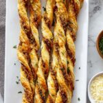 Crispy and flavorful puff pastry cheese straws seasoned with paprika, Italian herbs, and parmesan cheese. Perfect as a savory snack or appetizer, these cheese straws are easy to make and bake to golden perfection.