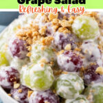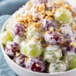 For special occasions, I like to present this grape salad in a clear glass trifle dish layered with whole grapes and chopped nuts so you get pretty layers. It also shines when spooned into individual parfait glasses topped with a sprig of fresh mint to elevate the look. You can’t go wrong with simple but elegant presentation!