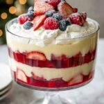A festive and colorful Christmas Trifle recipe featuring layers of Madeira cake, homemade cranberry jelly, fresh berries, thick custard, and whipped cream. This classic dessert combines tangy cranberry jelly with sweet custard and fresh strawberries, blueberries, and raspberries for a truly delightful holiday treat.