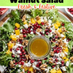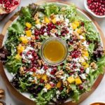 This festive Christmas Salad combines fresh spring mix greens with sweet persimmons, crunchy walnuts, and juicy pomegranate seeds, topped with crumbled feta cheese and a tangy honey mustard dressing. Beautifully arranged to resemble a holiday wreath, it’s a colorful and flavorful addition to any holiday table.