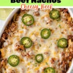 A flavorful and satisfying recipe for Ground Beef Nachos layered with spicy jalapeno refried beans, seasoned ground beef, melted pepper jack and sharp cheddar cheeses, topped with jalapeno peppers, and finished with a tangy sour cream lime drizzle and fresh cilantro garnish.