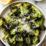 As soon as the broccoli comes out of the oven, drizzle it with lemon juice and sprinkle the zest and freshly grated parmesan over it. Toss everything quickly so the cheese slightly melts but doesn’t clump, then transfer to a serving dish. I always add a little extra parmesan on top because why not?