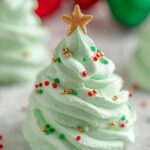 Create festive Meringue Christmas Trees with this simple recipe featuring whipped egg whites, sugar, and vanilla, tinted green and decorated with colorful sprinkles to resemble holiday trees. Crispy and light, these treats are perfect for holiday gatherings and gifts.