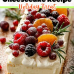 This Easy Christmas Cheesecake Slab is a no-bake, festive dessert perfect for holiday gatherings. Featuring a crunchy Biscoff biscuit crust and a creamy, smooth no-bake cheesecake filling stabilized with gelatin, it’s topped with fluffy whipped cream and vibrant fresh berries, cherries, orange slices, and rosemary sprigs for a stunning presentation.