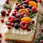 This Easy Christmas Cheesecake Slab is a no-bake, festive dessert perfect for holiday gatherings. Featuring a crunchy Biscoff biscuit crust and a creamy, smooth no-bake cheesecake filling stabilized with gelatin, it’s topped with fluffy whipped cream and vibrant fresh berries, cherries, orange slices, and rosemary sprigs for a stunning presentation.