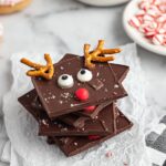 This Peppermint Reindeer Chocolate Bark is a festive and fun holiday treat featuring smooth milk chocolate adorned with mini pretzel antlers, candy eyeballs, red M&M noses, and crushed peppermint candy. Perfect for gifting or enjoying as a sweet snack during the holiday season.